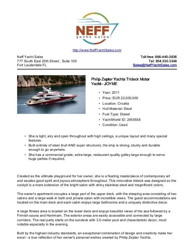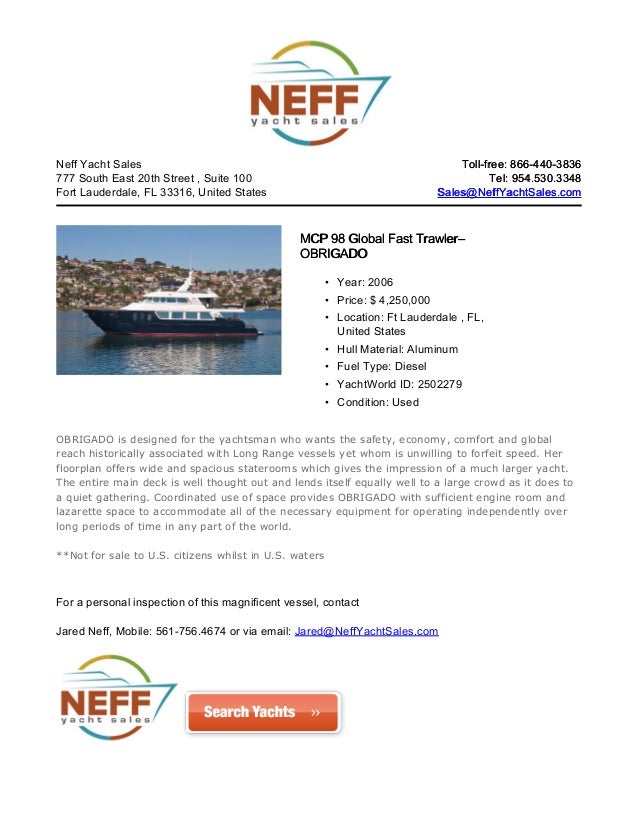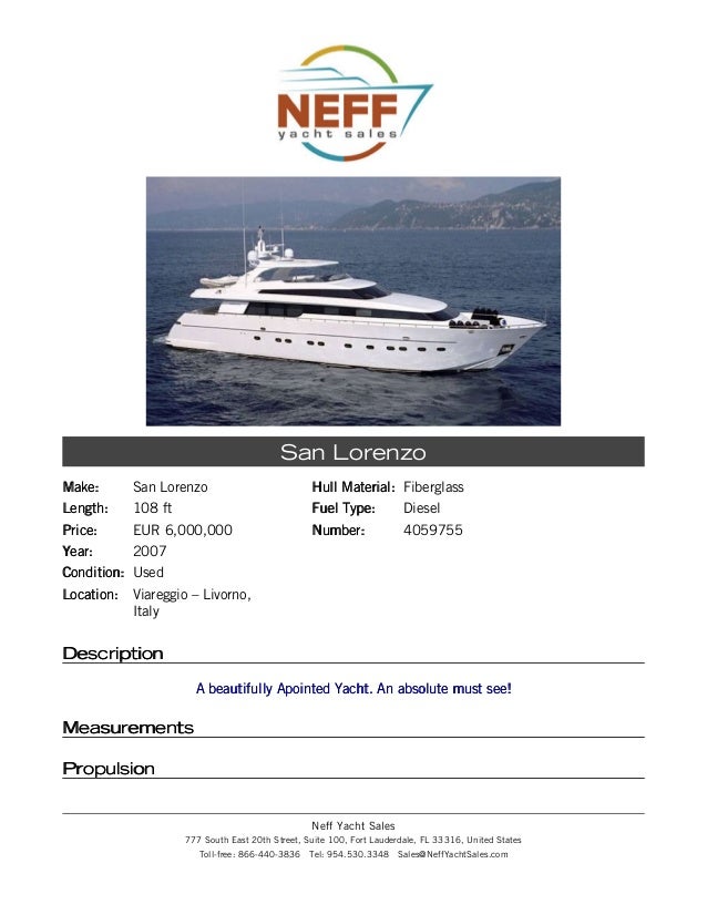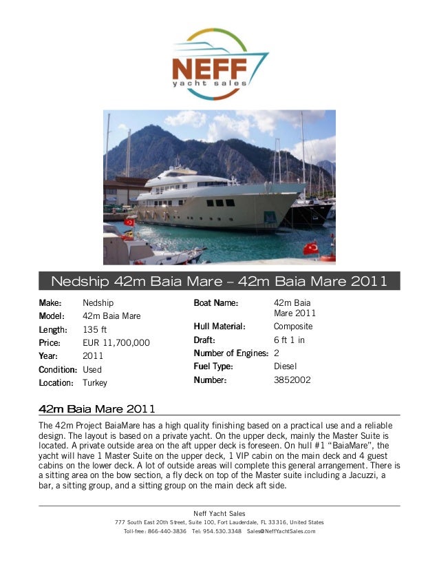 If you would like to buy a yacht Benetti 115 World Traveller — BENETTI or would like help answering any questions concerning purchasing, Disclaimer Neff Yacht Sales offers the details of this vessel in good faith but cannot guarantee ... Get Document